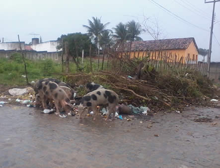 Porcos na cidade! Não é novidade, faz tempo que a cidade esta tomada por eles pois ate mesmo o entorno da prefeitura esta uma porcilga é o lixo que os moradores das casas enfrente a prefeitura colocam bem na calçada interrompendo a passagem dos pedestres que são obrigados a transitar na via pública além do terrível odor. E até um poste de ferro que esta inclinado há um bom tempo e nada é feito.