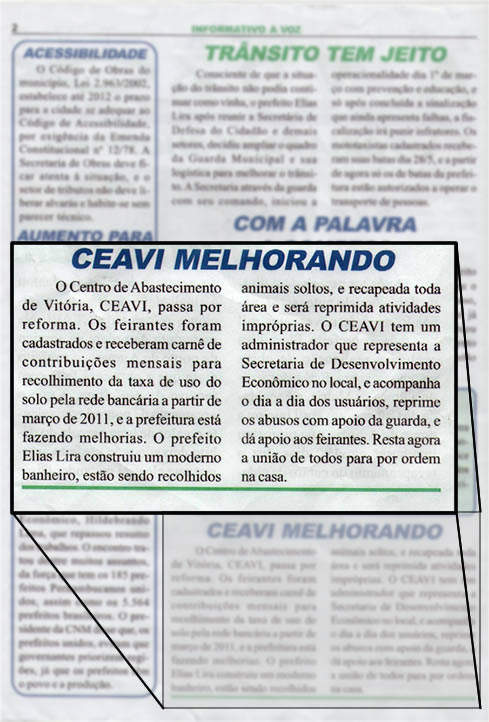 Em matéria veiculada no informativo A VOZ do mês de junho de 2011, onde a Prefeitura anunciava, entre outras realizações, a reforma da CEAVI e melhorias no que diz respeito a sua funcionalidade. Nossa redação recebeu denúncias de que aquele centro comercial estaria abandonado.