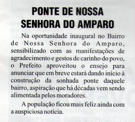 É oportuno lembrar, que essa mesma ponte já foi objeto de promessa em 2003 pelo então prefeito José Aglailson quando fazia a inauguração do posto médico de Nossa Senhora do Amparo, segundo o Jornal da Vitória da edição 153 de agosto de 2003.