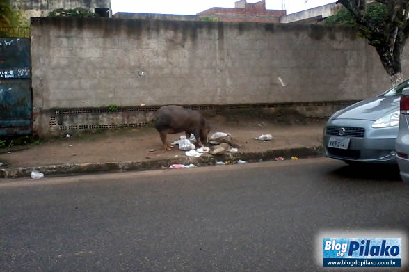 Hoje (26) durante o horário do almoço nossas lentes flagraram mais uma vez, um porco fuçando lixo no bairro do Cajá. É bom lembrar, que dias atrás postamos matéria onde mostramos o improviso das donas de casa para colocar os lixos nas calçadas e não serem “atacados” pelos animais. A Prefeitura que é o órgão competente para fiscalizar e até recolher os animais soltos nas ruas não está nem ai para a aflição da população.