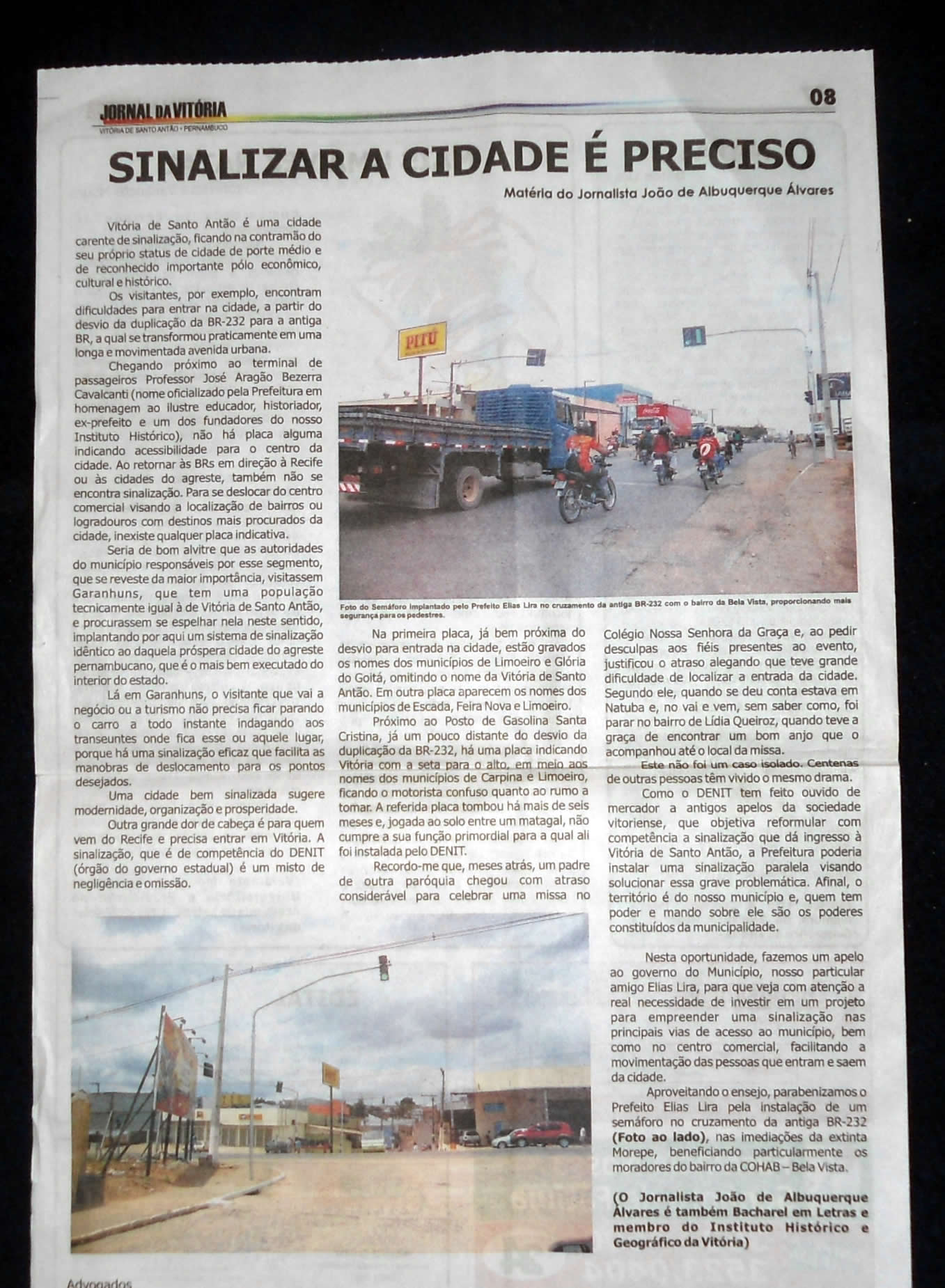 Conforme matéria assinada, há quase um ano, no Jornal da Vitória nº 185 de dezembro de 2010 pelo jornalista João de Albuquerque Álvares (foto) onde, com propriedade, escancarava a confusa sinalização aos que à nossa cidade se dirigiam, bem como a total carência de placas indicativas e orientadoras no centro da cidade, deixando assim, Vitória, segundo ele “na contramão do seu próprio status de cidade de porte médio e de reconhecimento importante polo econômico, cultural e histórico”.