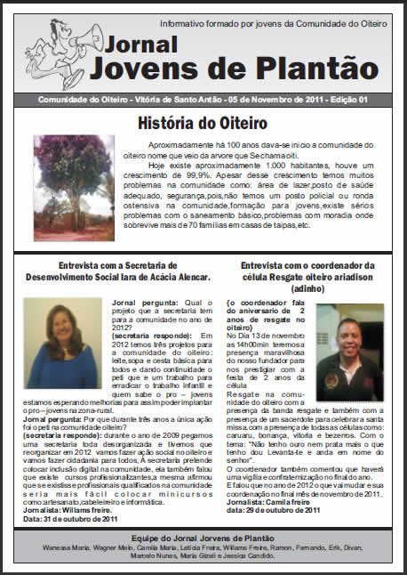 Já está nas ruas a primeira edição do jornal Jovens de Plantão, formado por moradores da comunidade do Oiteiro.