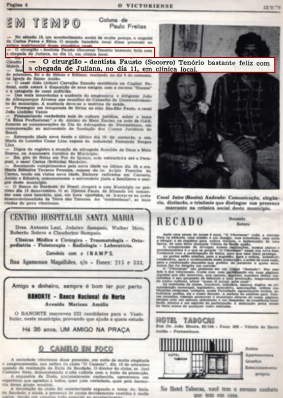 Na madrugada de hoje (28) nasceu no hospital Santa Joana, em Recife, a esperada Júlia. Os seus pais Júnior e Juliana Fook estão em estado de graça. É oportuno registrar um fato curioso: é que consta em nossos arquivos um exemplar de “O Victoriense”, edição 112 datada de 12 de outubro 1979 onde o “órgão noticioso e independente” na coluna social EM TEMPO” assinada pelo amigo colunista Paulo Freitas comunica aos vitorienses a felicidade do casal Fausto e Socorro Tenório da chegada da pequena Juliana, que hoje dá a luz a pequena Júlia.