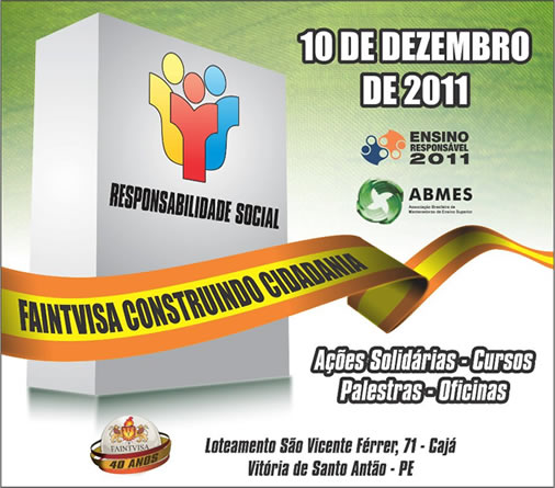 No próximo sábado (10), a partir das 8h, a FAINTVISA estará realizando um evento de responsabilidade social através de ações solidárias, cursos, palestras e oficinas. O evento conta com a participação efetiva de todos os cursos da instituição, entre alunos e professores.