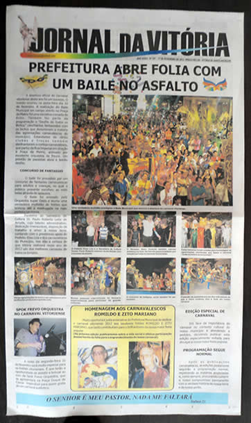 Dia 17 de fevereiro recebi alguns exemplares do “Jornal da Vitória”. O professor Ivan Lemosnovicht estava aqui em casa na ocasião. Juntos, lemos as matérias. O professor indaga se a matéria é mesmo sobre a abertura do carnaval da nossa Vitória. Leiam o que deixou registrado nosso caro professor moscovita: “atordoado e à cabeça a mil, tenho sob os olhos, o “Jornal da Vitória”, edição fevereiro, do amigo José Edalvo, que tece rasgados elogios à abertura do carnaval/2012, com uma referência às qualidades e méritos, no mínimo esdrúxula, a alguns membros da equipe do burgomestre Elias Alves de Lira. Fico pasmo com o profuso e imensurável linguajar. Nem tanto ao mar, nem tanto à praia. Somos mortais e limitados. Que conclusões tirarão, sobre a abertura do carnaval 2012, as futuras gerações, ao pesquisarem no acervo do IHGCSA, a história do nosso carnaval? Ou será que Edalvo sonhou está no País das Maravilhas e vislumbrou todo aquele encanto?