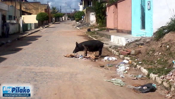 Na manhã de hoje (01) nossas lentes flagraram na Rua Silvino Lopes, no bairro do Cajá, uma porca se alimentando dos lixos nas calçadas, colocados pelas donas de casas, que aliás, já estão perdendo a paciência com a pouca vergonha. Por mais que o prefeito Elias Lira faça de conta que o problema dos bichos circulando na cidade não exista, toda população espera dele uma solução para esse, aparentemente, simples problema, já que o seu sobrinho Beto Lira, que segundo informações é na prefeitura o responsável pelos serviços de fiscalização e recolhimentos de animais, e até agora a bronca só vem aumentando.