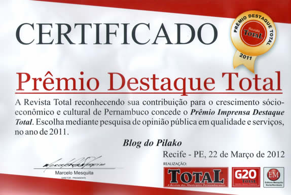 A equipe do Blog do Pilako agradece a Revista TOTAL, editada pelo articulado Marcelo Mesquita, pelo PRÊMIO IMPRENSA DESTAQUE TOTAL concedido ao nosso Jornal Eletrônico mediante pesquisa de opinião pública.