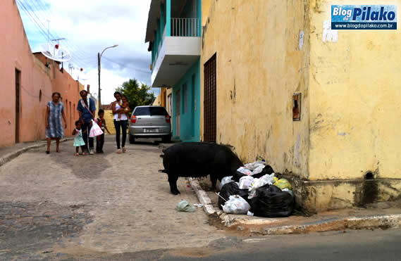 Na tarde de ontem (07) nossas lentes registraram cenas de constrangimento de uma família inteira, inclusive de crianças, ao ter de passar ao lado de um porco se alimentando na entrada da rua. Elias Lira deverá entrar para a história da cidade como o PREFEITO DE TODOS OS BICHOS, nunca se viu tanto animal solto, sobretudo porcos, circulando livremente pelas ruas da cidade.