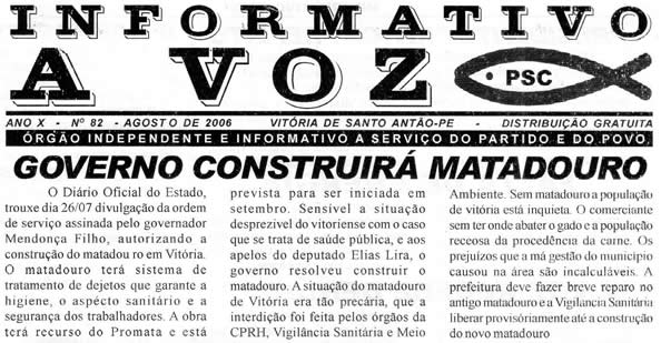 Ora!! Se lá atrás o Governador Mendonça Filho assinou a ordem de serviço para a construção de um novo matadouro em Vitória, divulgado em Diário Oficial do Estado com recursos do Promata, com as bênçãos dos deputados Elias Lira e André de Paula e seis anos depois é o próprio Elias Lira, como prefeito, é quem deixou o matadouro chegar ao ponto de ser fechado por falta de condições. Que moral tem Elias Lira para garantir que essas tais “ordens de serviços” não sejam apenas para iludir, mais uma vez, os crédulos e já apanhados eleitores vitorienses?