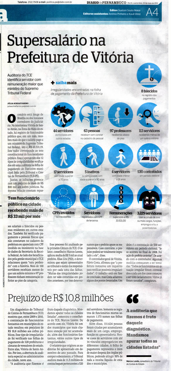 O Diário de Pernambuco de hoje (30) no seu caderno de POLÍTICA (página A4), em matéria assinada pela jornalista Júlia Schiaffarino, trouxe informações a respeito da auditoria do TCE realizada na Prefeitura da Vitória.