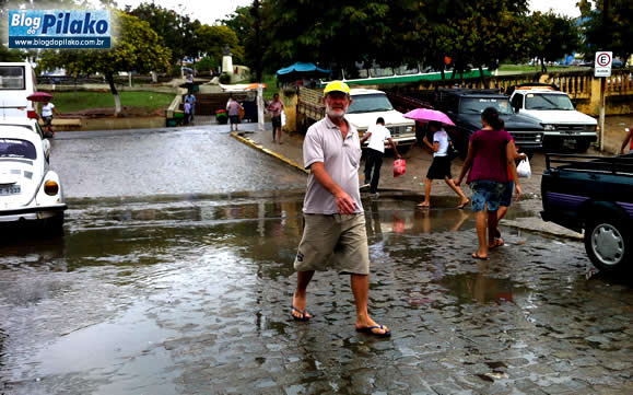 Em uma rápida chuvinha por volta das 14h de hoje (08), os transtornos no centro já começaram a aparecer. No trecho entre a Praça Leão Coroado e Praça 3 de Agosto a rua ficou alagada obrigando as pessoas a “meter” o pé na lama.