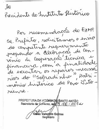 – o Instituto não enviará nenhum outro requerimento; – para a direção da entidade o que tinha que ser feito, já foi feito; – a prefeitura sabe o caminho e sabe como sanar os danos; o empecilho, alegado pela Procuradoria, o imóvelser tombado pela FUNDARPE, foi removido.