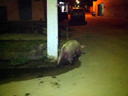 Internauta Rafael Magalhães registra porco circulando pelas ruas do Cajá dizendo: “Vitória ainda é uma cidade de índios, temos que conviver com bichos. É pra se lascar!” – lamentou o internauta.
