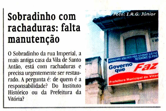 Muito bem, é bom lembrar que o jornal com a referida matéria circulou em nossa cidade em outubro de 2004. Hoje, quase uma década depois, o sobradinho está de mau a pior. Entra prefeito, sai prefeito e esses sujeitos não estão nem aí para os patrimônios  culturais da cidade, como a  única casa remanescente da então Vila de Santo Antão.