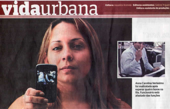 Em matéria exibida no dia de ontem (11) no caderno Vida Urbana do DIÁRIO de PERNAMBUCO, com o título A REAÇÃO DA CIDADANIA, escrita pela jornalista Ana Maria Nascimento, onde a consultora de vendas Anna Carolina Veríssimo, após esperar mais de quatro horas pelo atendimento em uma unidade do DETRAN, se sentiu humilhada pelo funcionário e resolveu, após filmar o ocorrido com seu celular, protestar através das redes sociais.