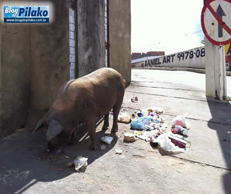 Nossas lentes flagraram na tarde de ontem (08) nas proximidades do Viaduto do Cajá, uma porca se alimentando de lixo e promovendo a maior sujeira na calçada. Em praticamente todos os bairros da cidade a “pisada” é a mesma.