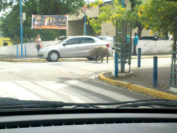 “Porquinho passeando e atrapalhando o trânsito em frente ao Fórum em plena manhã de 14/08/2012.”