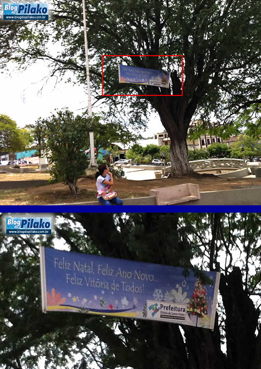 Apenas para ilustrar, mais um desgoverno da gestão sob o comando do Prefeito Elias Lira, na Praça 3 de Agosto ainda tem uma faixa, desejando feliz natal, pendurada nas árvores que foi colocada pela própria Prefeitura ainda no ano passado (2011).