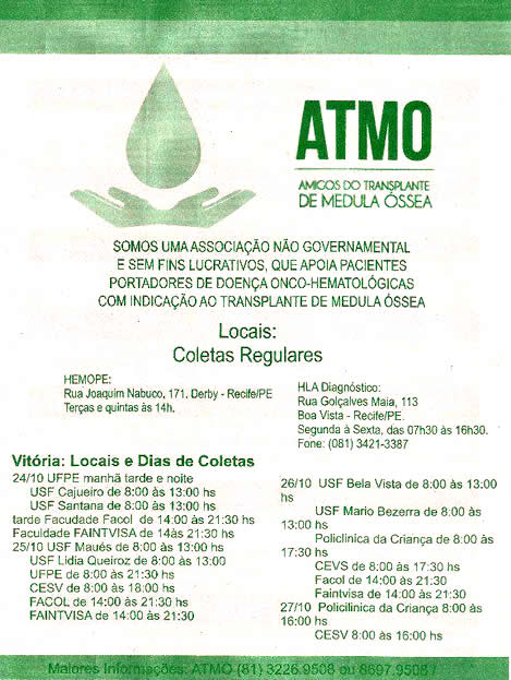 A ATMO é uma Associação não governamental e sem fins lucrativo, que apoia pacientes portadores de doença ONCO-HEMATOLÓGICA com indicação de Transplante de MEDULA ÓSSEA.