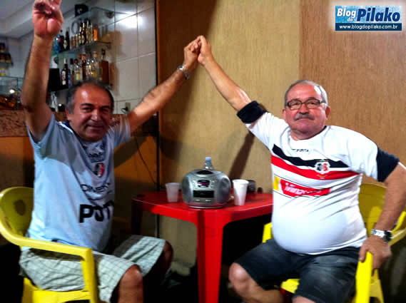 Encontramos os amigos tricolores Moisés Sales e João Vitor, vestidos a caráter, na Praça da Matriz ouvindo pelo rádio o jogo do SANTINHA. No intervalo, onde os resultados e as combinações dos jogos dos concorrentes garantiam a classificação esbanjavam otimismo. O segundo tempo chegou e com ele os maus resultados também, sendo assim, para os amigos fica a lição, no futebol não se pode fazer carnaval FORA DE ÉPOCA. (rsrsrsrs)