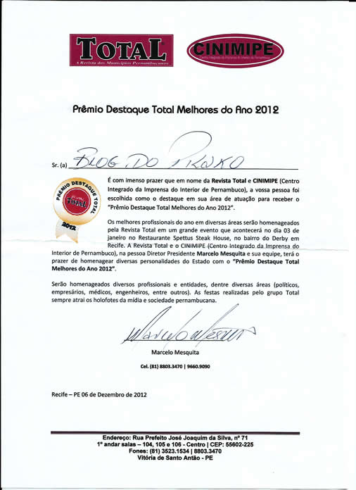 Dias atrás recebemos a visita em nossa redação, do articulado publicitário vitoriense Marcelo Mesquita, que veio nos entregar o convite para o evento, promovido pela Revista TOTAL, intitulado MELHORES DO ANO 2012.