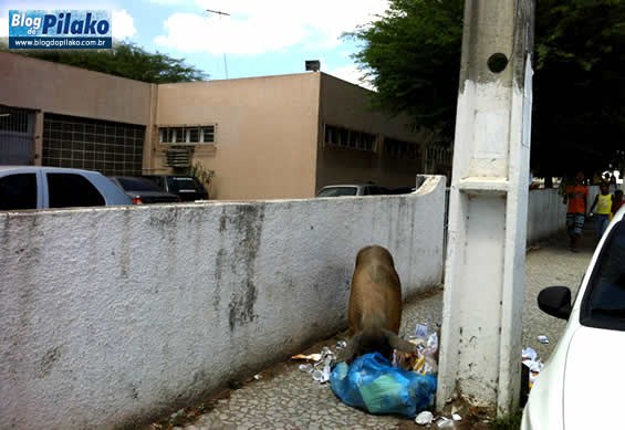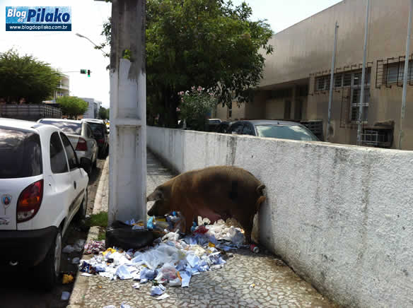 Na manhã de ontem (20), por exemplo, registramos uma foto que, para os mais atentos, quer dizer muita coisa. Uma porca com seu filhote, se alimentando de lixo na calçada do Fórum da cidade em pleno funcionamento.