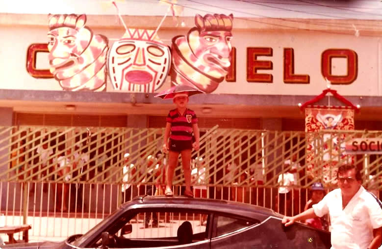 Joel Neto no Carnaval de 1984 aguardando a saída do Clube Vassouras o Camelo. O garoto é o seu filho Joel Bisneto.