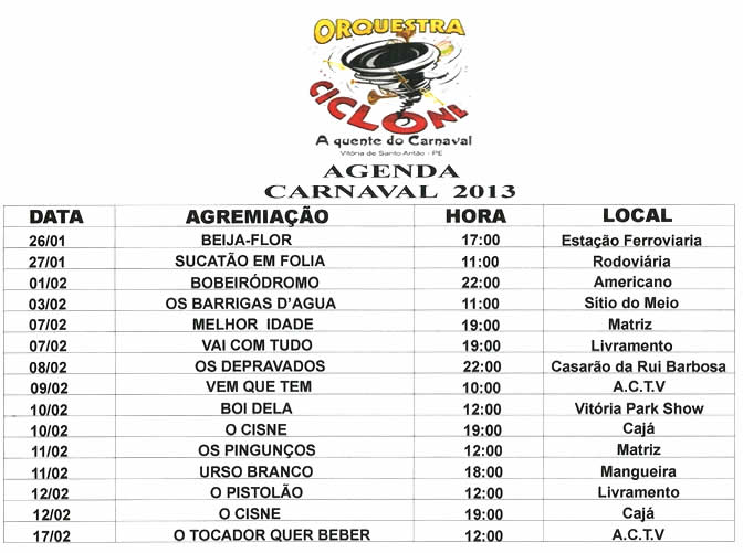 Na ocasião, o Maestro nos disse que vem ensaiando com o pessoal desde do segundo semestre do ano passado, e portanto, deve fazer bonito nas ruas da Vitória. O Maestro Givaldo também nos forneceu a agenda da Orquestra Ciclone. Confira:
