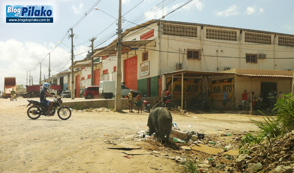 Nossas lentes flagraram na tarde do sábado (16) as margens da movimentada Avenida Henrique de Holanda, mais precisamente na rua que dá acesso, entre outros, ao bairro  Loteamento Conceição, uma porca se alimentando de lixo.