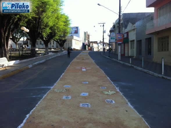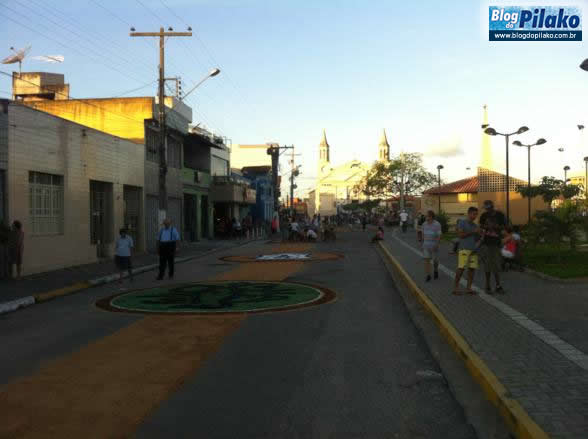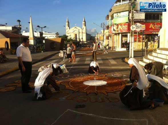Já no bairro da Matriz os bonitos tapetes foram ornados nas ruas no entorno da Praça Dom Luis de Brito formando-se assim, um bonito cenário para a tradicional procissão.