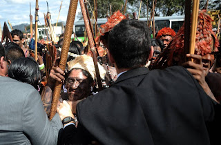 Índios Munduruku e Arara estão uma arara com um canteiro de obras em Belo Monte. Tomaram um choque quando souberam que era a instalação de uma hidrelétrica. Pegaram carona nos Terenas, que também perderam a paciência com o assassinato de um índio e foram reclamar em Brasília. É tanta raiva que um índio esfregou uma flecha no focinho de um cara-pálida. Os Mundurukus estão que não podem ver um espantalho de paletó e gravata.