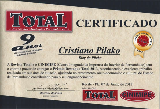 Blog do Pilako: Prêmio Destaque Total 2013. Publicado em 12 de junho de 2013 por Nós que fazemos a equipe do BLOG DO PILAKO agradecemos à Revista Total e o CINIMIPE pelo reconhecimento ao nosso trabalho. Parabéns ao articulado Marcelo Mesquita por mais um evento realizado com sucesso.