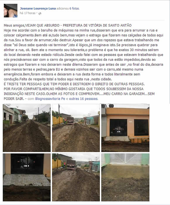 Internauta Joseane Lourenço reclama de serviço mal feito em sua comunidade
