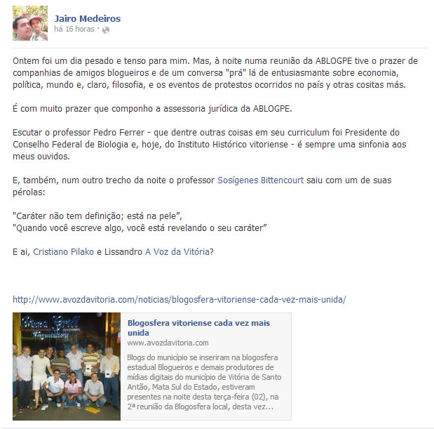 Diretor da ABLOGPE, Jairo Medeiros, comenta a terceira reunião dos Blogueiros Vitorienses Publicado em 4 de julho de 2013 por Arquiles Petrus