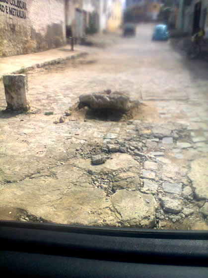 “Se você não aguenta mais o trânsito na sua rua; chegou a solução para o seus problemas!!!! Feche o acesso delas com enormes pedras fixadas com cimento…Simples assim!!! Rua no fim dos Ferreiros, próximo à igreja dos mormos.”