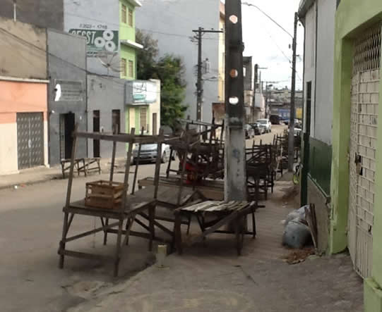 Mesmo após o fim da Feira, grande parte dos bancos ficam amontoados entre as Ruas Estevão Cruz e André Vidal de Negreiros em pleno domingo. A Prefeitura de Vitória desrespeita decisões acordadas no Ministério Público, o qual determinou que os mesmos fossem retirados até às 20:00h do sábado enquanto não se transfere a Feira para um local adequado. Por falta de espaço, a Feira Livre avançou de forma desordenada bloqueando residências e congestionando o trânsito já bastante caótico. A prefeitura fere o Direito Constitucional de ir e vir dos cidadãos e coloca em risco também as nossas vidas, pois se houver emergências de qualquer natureza (médicas, incêndios, etc), como poderemos socorrer nos familiares em tempo hábil? Vitória está na contramão de outros municípios que já organizaram/transfiram suas Feiras para áreas apropriadas!