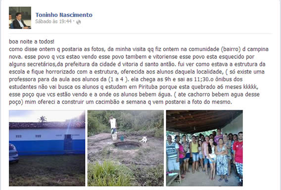 Em nosso bate-papo político, Toninho demonstrou certo descontentamento nas questões administrativas por parte da gestão do Governo de Todos, comanda pelo Prefeito Elias lira, principalmente, nas pastas comandadas pelas sobrinhas Maria José Lira (Educação) e Veraluci Lira (Saúde). Encerrando nosso encontro o Vereador ficou de nos enviar uma postagem sua Facebook. Veja postagem:
