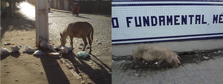 Não sei como está ai o controle feito pelo blog em relação aos bichos soltos nas ruas da cidade… Só sei que hoje à tarde (quinta-feira, 15/08/2013) saindo da Escola Senador João Cleofas de Oliveira (ao lado da AABB), local onde trabalho, deparei-me com esse simpático jumentinho fazendo a festa no lixo… Em seguida (praticamente na mesma hora) ao me dirigir para a escola Professora Amélia Coelho (aquela por trás do Posto Petrobras) como faço todas as tardes para buscar minha esposa que lá trabalha, eis que quem deu as caras dessa vez foi Dona Porca… Mas está uma esculhambação mesmo não é???