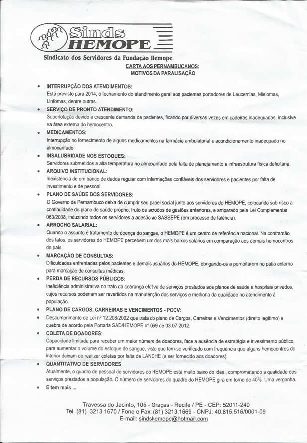 Durante minha visita ao plenário da Assembleia Legislativa na ultima quarta (21), dentro da programação oficial do evento ALEPE DIGITAL, observei um movimento dos integrantes do Sinds Hemope, juntamente com alguns pacientes atendidos pela Fundação Hemope.