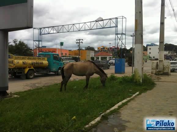 Já no sábado (24) nossas lentes registraram às margens da movimentada Avenida Henrique de Holanda, em frente ao Posto Petrobrás, um cavalo pastando no canteiro do referido posto de combustível.
