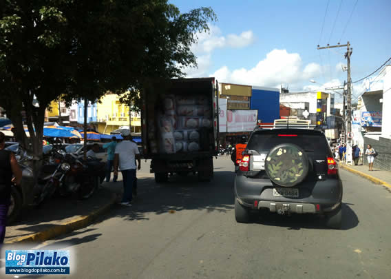 Na manhã de ontem (26) nossas lentes registraram um caminhão tipo baú estacionando no largo da Praça Duque de Caxias descarregando mercadorias e, consequentemente, atrapalhando o fluxo de veiculo na única via do centro da cidade no sentido Matriz\ Livramento.
