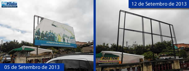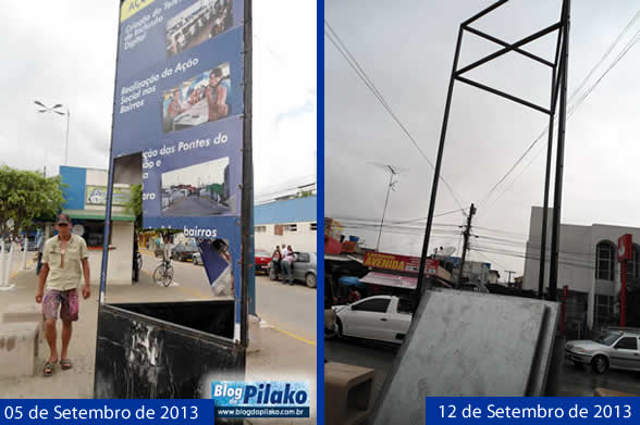 Voltando à matéria da última quinta (05), onde falamos das placas da prefeitura que estavam emporcalhando a cidade e até com o risco de acidentar alguma pessoa, gostaríamos de dizer que o que não fizeram em um ano, após nossa matéria, em 7 dias da já tomaram atitude para resolver os problemas relativas às placas, sendo assim, não posso deixar de dizer: BLOG DO PILAKO BOTA PREFEITURA PARA TRABALHAR.