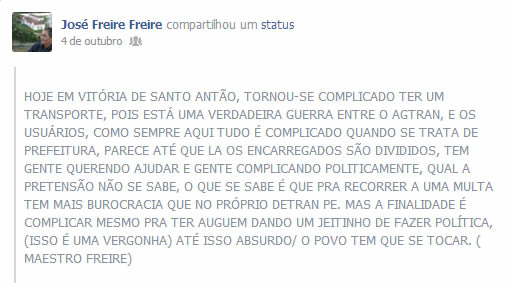 Internauta, Maestro José Freire, comenta sobre AGTRAN Publicado em 7 de outubro de 2013 por Arquiles Petrus