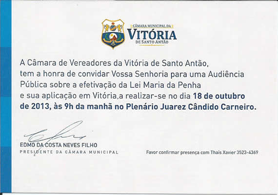 Registramos o recebimento do convite da Câmara de Vereadores da Vitória para Audiência Pública sobre a efetivação da Lei Maria da Penha, que acontecerá no próximo dia 18 de outubro às 9h no Plenário da Casa.