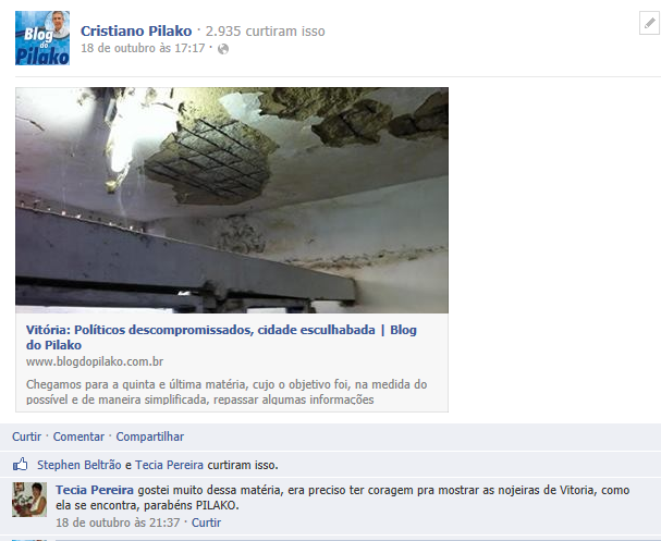 Internauta Tecia Pereira interage pelo Facebook, parabenizando o Blog Publicado em 22 de outubro de 2013 por Arquiles Petrus