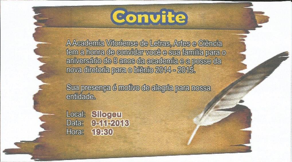 Convite da Academia Vitoriense de Letras, Artes e Ciência Publicado em 31 de outubro de 2013 por Arquiles Petrus
