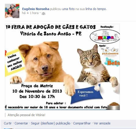 Internauta Eugênio Noronha divulga a 1º Feira de Adoção de Cães e Gatos de Vitória Publicado em 7 de novembro de 2013 por Arquiles Petrus