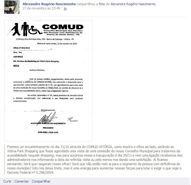 Internauta Alexandre Nascimento diz que falta acessibilidade no Shopping Publicado em 29 de novembro de 2013 por Arquiles Petrus