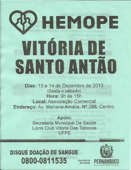 Hemope está realizando coleta de sangue em Vitória Publicado em 13 de dezembro de 2013 por Arquiles Petrus