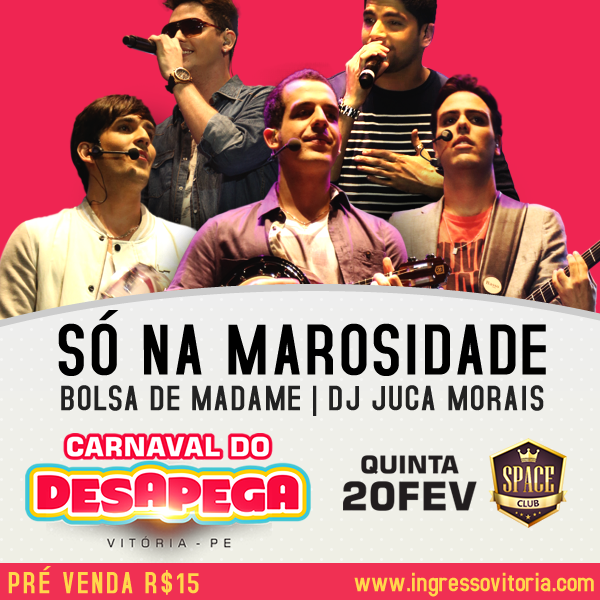 O Carnaval do Desapega, marcado para o dia 20 de fevereiro, na Space Club, com as atrações: Só na Marosidade, Bolsa de Madame e o DJ Juca Morais, já iniciou sua pré-venda do 1° lote de ingressos pela internet e com revendedores autorizados, no valor promocional de R$ 15 até a próxima sexta-feira, dia 24/01.